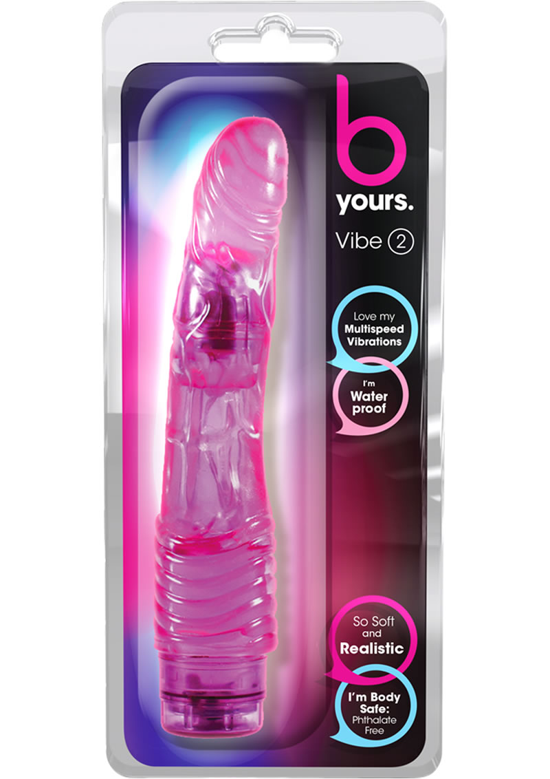 Blush Novelties B Yours Vibe #2 is an 9 inch realistic vibrator with veins and twist dial base for multi-speed vibration. It’s tapered head and thin shaft can be comfortably and easily inserted. Created for the beginner and for the cost conscious, Vibe #2 is made of phthalate free PVC and powered by 2 AA batteries, not included.