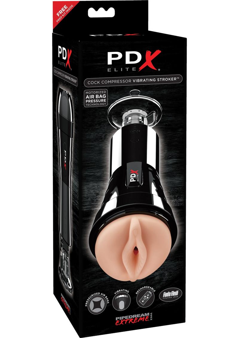 Innovative air bag technology is designed to inflate and deflate while surrounding your shaft with stimulating squeeze and release pleasure. Multiple air bags with multi functions, combined with powerful air-tight suction to milk every inch of your cock, will give you the best masturbation experience of your life! Air-tight suction ensures that tip in or balls deep, the PDX Elite Cock Compressor Vibrating Stroker will give you incredible multi-action sucking and milking masturbation. A super-smooth, lifelike Fanta Flesh interior sleeve lined with massaging ribs, bumps and pleasing textures will fulfill your fantasies with every thrust. For fully automated vibration, simply press the button on the powerful rechargeable motor and enjoy 10 patterns of teasing vibrations that travel all the way up your shaft.Explore your options! The sturdy exterior case features an adjustable locking suction cup that can be attached to any flat surface and adjusted to the perfect angle for hands free fun. Remove the interior Fanta Flesh sleeve for handheld pleasure.Lifelike Fanta Flesh Material – Our super-soft Fanta Flesh mimics the feel and warmth of real skin.Powerful Vibrating Functions – A super-strong rechargeable motor provides 10 patterns of stimulating vibrations. Press once to activate and hold for 3 seconds to release. 5 Function Air Bag Pressure Control – Advanced air bag design applies just the right amount of pleasing pressure. Press to activate and hold for 3 seconds to release.Air Tight Super Suction – Squeeze and release pleasure with the press of a buttonAdjustable Locking Suction Cup – Intensely powerful suction allows attachment to almost every flat surface with an innovative twisting lock design for an extra strength connection.