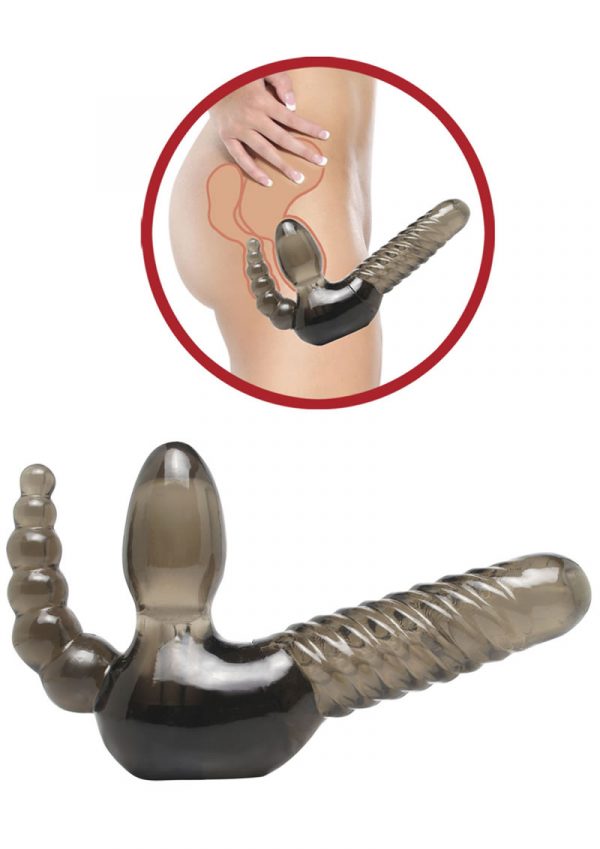 Get hands-free stimulation and hot, face to face sex with the Strapless Strap-on with Anal Stimulator. Cleverly curved at just the right angle, this strapless double dildo stays inside the wearer with each passionate thrust. The ribbed, bulbous plug stimulates the driver’s g-spot, while the long, ribbed shaft delivers incredible sensations to her partner. The ribbed shaft is spiraled for extra stimulation, while the graduated anal beads provide anal delights for the wearer. The ergonomically designed dildo stays in place when the action heats up, allowing you to enjoy hands-free penetration without a harness or strap. It’s great for both women and men and can be used with either end in the vagina, anus or hand. Use plenty of Moist lubricant for an extra wet, extra wild encounter. Best of all, cleanup is a snap after the fun with Pipedream Toy Cleaner and warm water.