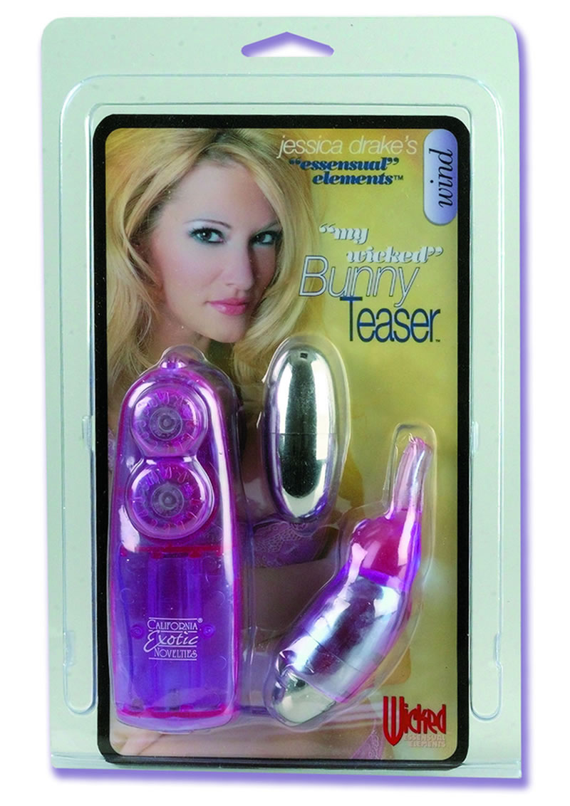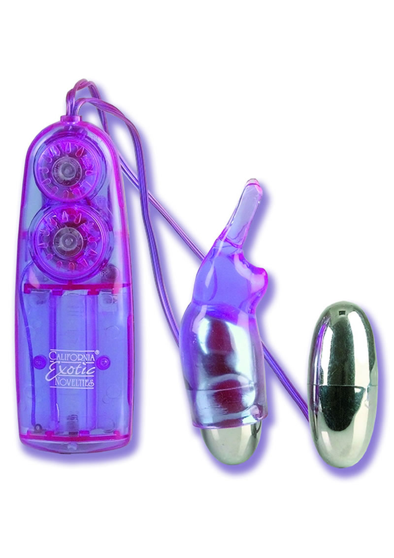 Two ultra-powerful independently controlled bullets with a removable Crystalessence jelly bunny clit teaser. Versatile, 5 foot cords for creative use of range. Multi-speed. 3 AA batteries.