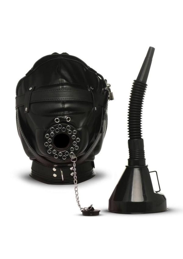 Elevate your bondage play with the Degraded Sensory Deprivation Hood with Funnel. This meticulously crafted hood provides a perfect fit through its adjustable straps and lockable buckles. The built-in, padded blindfold ensures total darkness, while the padded ear sections muffle any noise for heightened sensory deprivation. The mouth hole includes a removable plug, allowing for the use of the funnel to administer liquids or food directly into the mouth. Featuring a built-in collar with a D-ring for leash attachment, it is perfect for prolonged sessions. Soft inner padding ensures that it remains comfortable, even during long periods of wear. Locks and keys are included.