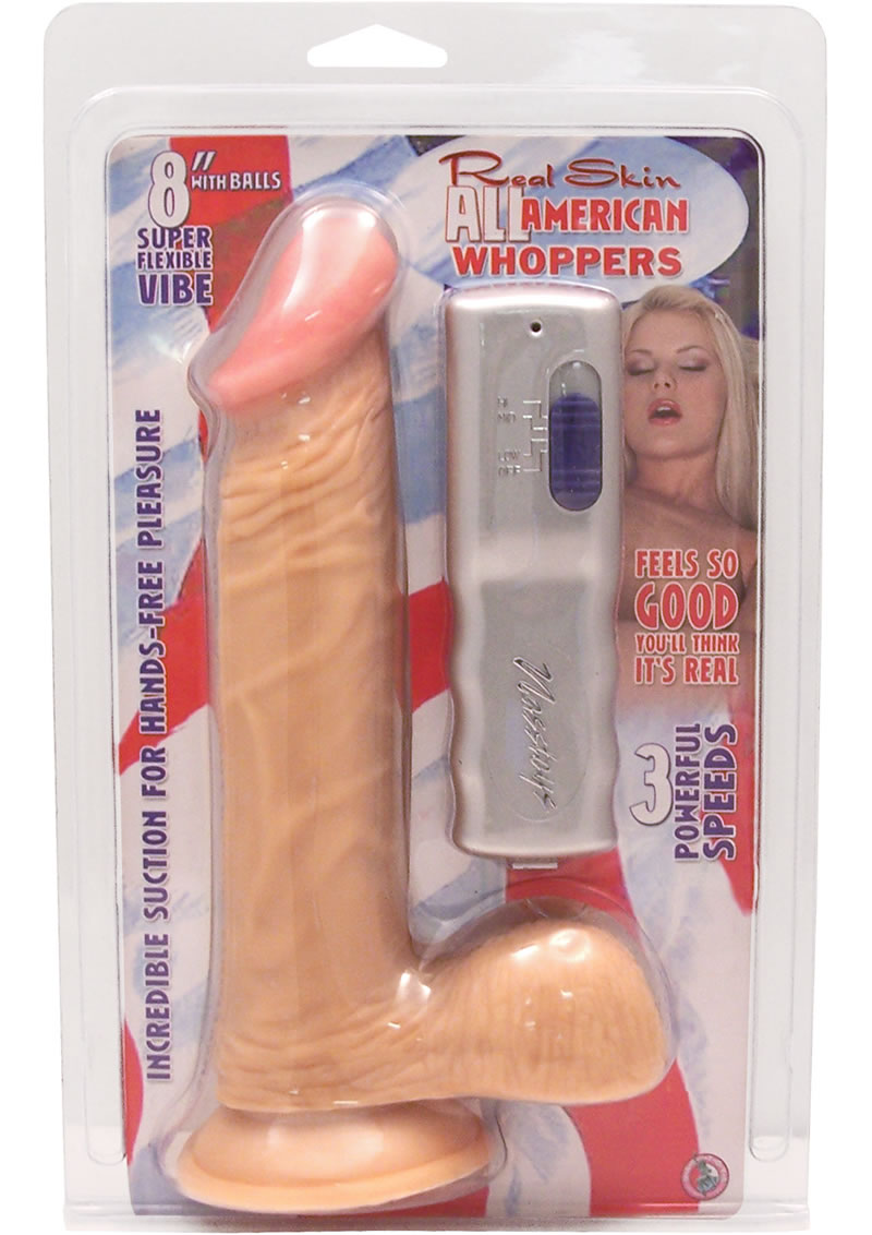 Finally a dildo sculpted for the size, feel and pleasure of the real thing! The Real Skin All American Whopper, 8 inch super-flexible dong with balls. Feels so good you’ll think it’s real! The incredible suction cup base offers hands-free pleasure and satisfaction. Experience your multi-speed vibrating All American Whopper tonight. Vibrating dildo stands 9 inches, with an insertable length of 8 inches,1.5 inches in width and a circumference of 5 inches. The dildo plugs right into the 3 powerful multi-speed controller. 3 AA batteries, not included.