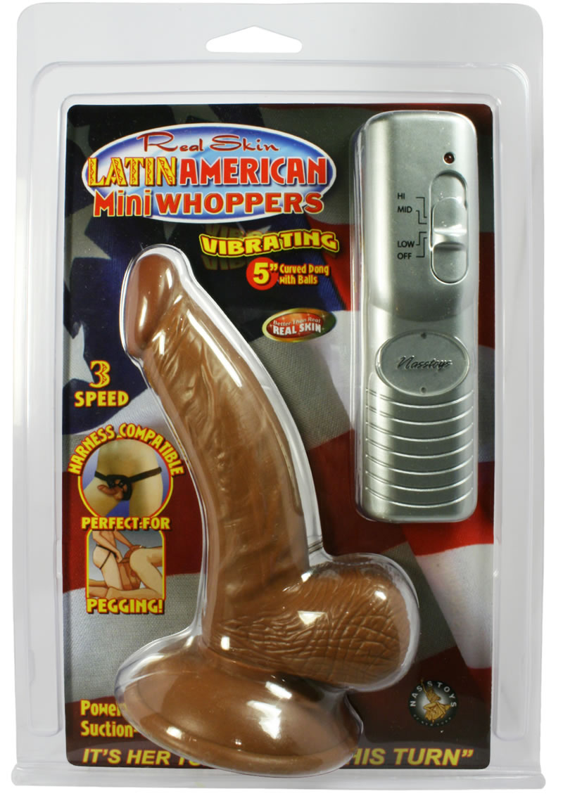 Latin American Mini Whoppers 5 inches Curved Dong with Balls Flesh Vibrating. Feels so good you will think it is real! Sculpted for the size and feel of the real thing. Real skin super flexible dong with suction cup base. Harness compatible. Perfect for pegging. It is her turn, to make it his turn. Made using phthalates free, non-toxic materials shaft PVC, bullet vibrator ABS plastic. A water based personal lubricant is recommended. Always clean before and after use. Latin American Mini Whoppers 5 inches Curved Dong with Balls Flesh from Nasstoys of New York.