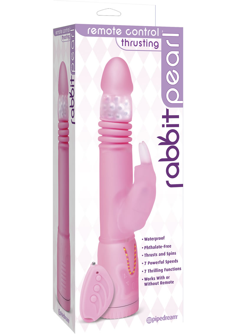 Get pleasure hopping with the Remote Control Thrusting Rabbit Pearl! This is the deluxe version of our original, best-selling Rabbit Pearl and it’s loaded with features and functions. Made from super soft phthalate-free TPR, this triple-action rotating vibe boasts a thrusting shaft, spinning pleasure pearls, and a vibrating clit stimulator that teases and pleases. With seven powerful speeds and seven pulsation patterns to choose from, the pleasure possibilities are endless. The vibe can be controlled with or without the remote, and the bright LED displays the power of both the thruster and clitoral vibration. To change pulsation patterns, simply press the function button on either the remote control or the vibe’s controller and go from a flutter to a throb in seconds!